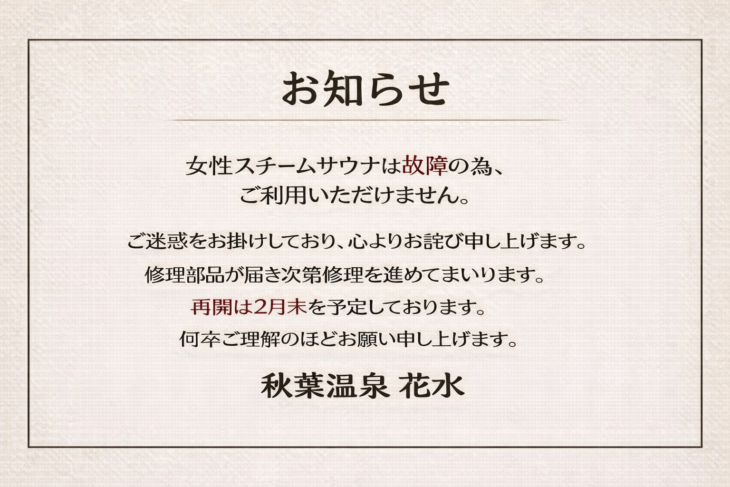 女性スチームサウナ故障のお知らせ
