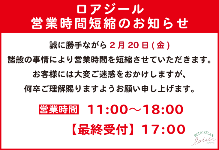【2月20日(金)】ロアジール営業時間短縮のお知らせ