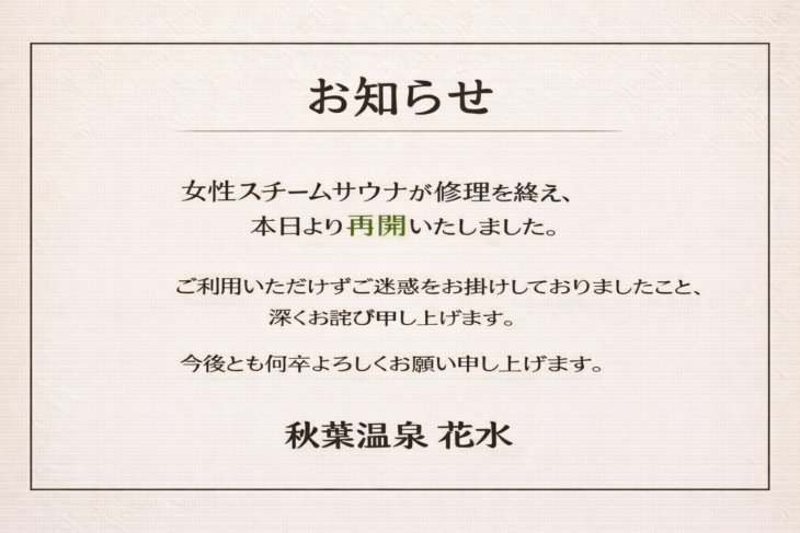 【3月15日】女性スチームサウナ再開のお知らせ